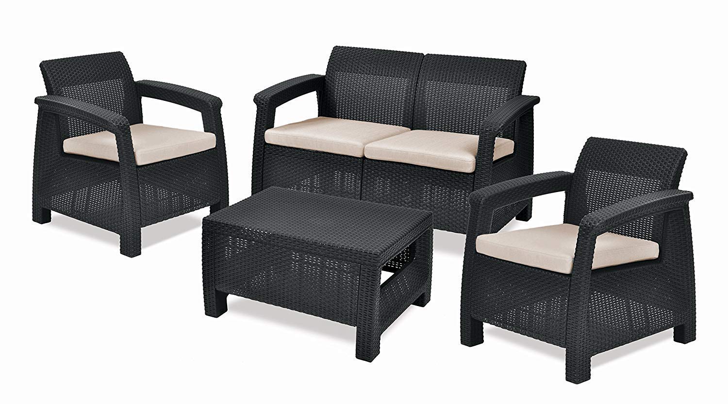 We call it comfortable outdoor furniture. If you just enjoy sitting out amongst the greenery, then a garden bench is a classic option. This lounge set includes a 2 seater sofa, 2 armchairs, and a matching coffee table, so that you can sit and relax in the garden with drinks or snacks. Clever, stylish and durable plastic outdoor storage solutions and garden furniture to create amazing spaces. Buy keter emily 4 seater rattan effect sofa set at argos.